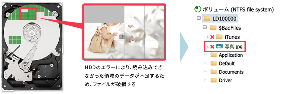 HDDの物理的なエラーによって一部のブロックが読み込めない場合、そのブロックを使用していたデータは、破損データになります。LIVEDATAではこのブロックを技術的に逆引きして、どのデータが破損しているかを分析し、お客様がわかりやすいように別フォルダに保存しています。